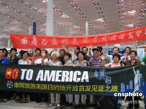 6月17日晚21點(diǎn),北京康輝旅行社美國(guó)游首發(fā)團(tuán)游客71人從首都國(guó)際機(jī)場(chǎng)直飛洛杉磯,這也是迄今為止人數(shù)規(guī)模最多的赴美旅游團(tuán)。此次首發(fā)團(tuán)的行程為期12天,目的地涉及洛杉磯、圣地亞哥、布法羅、華盛頓、費(fèi)城、紐約等美國(guó)東西海岸主要城市,參觀包括好萊塢環(huán)球影城、迪斯尼樂園、蓋蒂中心博物館等在內(nèi)的經(jīng)典景點(diǎn)。中新社發(fā) 張愛衡 攝
