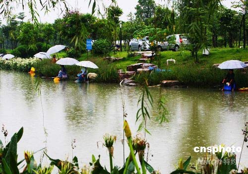 2008年6月26日下午,風(fēng)雨飄搖,但廣東佛山市東平新城佛山公園內(nèi)依然有不少市民冒著風(fēng)雨在此悠閑垂釣。當日,臺風(fēng)離開佛山,但雨水遲遲沒有離去。據(jù)廣東氣象臺預(yù)報,未來三天,廣東全省大部將維持大到暴雨。中新社發(fā) 春添 攝
