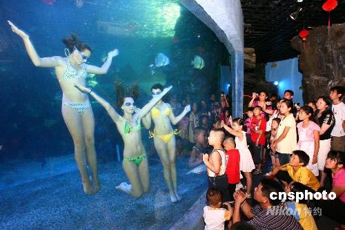 6月27日開始,福州左海海底世界再次邀請俄羅斯水中運(yùn)動員前來表演,他們向市民們展示富有世界盛名的花樣游泳——水下芭蕾,促進(jìn)市民們更加關(guān)注奧運(yùn)賽事。據(jù)介紹,本次表演隊來自俄羅斯遠(yuǎn)東奧林匹克運(yùn)動中心,她們年齡在14-20歲,是專業(yè)的花樣游泳運(yùn)動員,從四歲起就進(jìn)行了形體、舞蹈、體操芭蕾等方面的專業(yè)訓(xùn)練,曾榮獲俄羅斯花樣游泳錦標(biāo)賽青少年組第二名。 在左海海底隧道大鯊魚展池中,俄羅斯姑娘們不帶任何潛水裝備,憑著自己高超的水中技能,共同完成一個又一個高難度的動作,綻放的石榴花、佛座蓮花、芙蓉盛開、穿梭時空、南海觀音、轉(zhuǎn)體720度等形體造型定變幻多姿,精彩絕倫。中新社發(fā) 祝敏松 攝