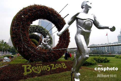 6月30日,沈陽市政府廣場西側(cè)的大型立體組合花壇雕塑《騰飛》完工。該雕塑是繼大型花壇雕塑《中國印》之后,綠化部門為了迎接奧運會又一大手筆。該雕塑高5米、長20米,用了萬余盆五色花卉裝點五環(huán)。雕塑表現(xiàn)了一名運動員正在跨越奧運五環(huán)的各個瞬間,生動形象、寓意深刻。 中新社發(fā) 文契 攝
