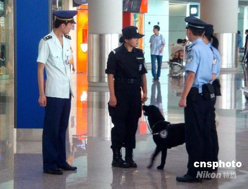 7月第一個(gè)周末,一位中國女特警牽著搜索犬到北京首都機(jī)場新大廳集結(jié)上崗,為保衛(wèi)北京奧運(yùn)會(huì)服務(wù)。中新社發(fā) 賈國榮 攝
