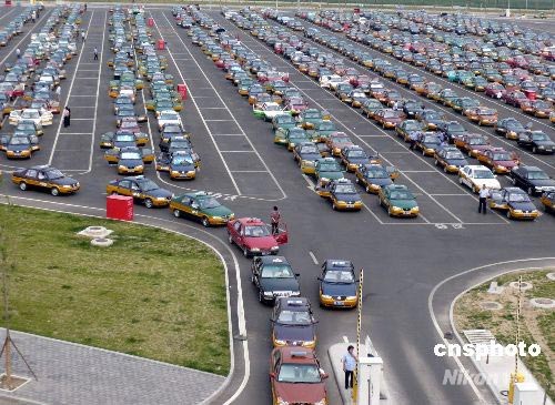 2008年7月6日,北京首都機場內(nèi)的出租車排成了長龍。據(jù)悉,北京將于2008年7月20日全面實行機動車單雙號限行。在此期間,北京市6.6萬輛出租車將保持95%以上的出車率,可日增加60萬人次運力,達到每天248萬人次。 中新社發(fā) 樊甲山 攝