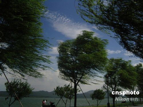 7月28日,山雨欲來風(fēng)滿樓,受今年八號臺風(fēng)“鳳凰”的影響,往日寧靜的杭州西子湖畔狂風(fēng)大作,白堤上的柳樹“狂舞”不斷。中新社發(fā) 柴燕菲 攝