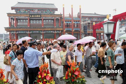 8月7日,眾多北京市民及外地游客在警察的疏導下,有次序地參觀改造后的北京前門大街。當日,北京前門大街正式對外開放。經(jīng)過2年多的擴建、改造,老牌樓、有軌電車、老字號店鋪重現(xiàn)老北京時的風貌。中新社發(fā) 史利 攝
