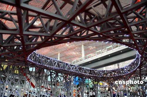 8月12日,北京首都機場T3航站樓搭建一處類似于“鳥巢”體育館的景觀,歡迎奧運賓朋。 中新社發(fā) 廖攀 攝
