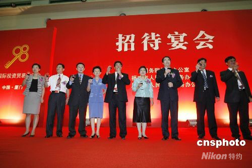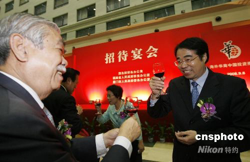 九月八日晚,國(guó)務(wù)院僑辦在廈門設(shè)宴款待出席“2008海外華商中國(guó)投資推介會(huì)”高端訪談及“改革開放三十年僑資企業(yè)成就展”的嘉賓,國(guó)務(wù)院僑辦、福建省僑辦及廈門市僑辦領(lǐng)導(dǎo)上臺(tái)感謝僑商僑資為祖國(guó)經(jīng)濟(jì)建設(shè)付出的努力。中新社發(fā) 王麗南 攝