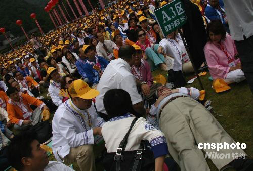 9月12日上午,2008年中國湖南國際旅游節(jié)在張家界國家森林公園開幕,湖南借助國際旅游節(jié)這一機遇向世界展示自身獨特的旅游資源和旅游產業(yè)發(fā)展狀況。500余名境內外旅行商和媒體記者受邀觀看開幕式表演,一位胖老外坐著看覺得不舒服,直接躺在草地上,引起了一場小誤會。中新社發(fā) 張家根 攝