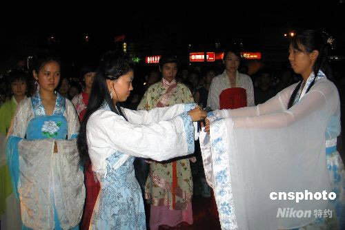 九月十三日,西安一些漢服愛好者在大雁塔北廣場舉行祭月典禮,旨在重視民俗,提倡傳統(tǒng)回歸。圖為漢服祭月的現(xiàn)場。中新社發(fā) 冽瑋 攝