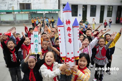 9月25日下午,河南南陽市第十八小學(xué)的小學(xué)生在歡呼慶祝我國的“神七”即將發(fā)射。當天,“神七”任務(wù)總指揮長常萬全的家鄉(xiāng)——南陽市臥龍區(qū)在以各種方式祝福“神舟七號”飛船發(fā)射計劃圓滿成功。世界矚目的“神舟七號”飛船將于當晚發(fā)射。中新社發(fā) 熊運彬 攝