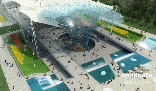 2010年上海世博會中央景觀道路“世博軸”進(jìn)入全面施工階段,圖為首次公布的“世博軸”主出入口“陽光谷”造型效果。據(jù)介紹,“世博軸”的一端也是上海世博園區(qū)的主出入口,整個“世博軸”在入口及沿途共設(shè)6個巨型圓錐狀“陽光谷”!瓣柟夤取辈捎娩摻Y(jié)構(gòu),其功能是讓自然光透過透明“圓錐”傾瀉入地下,滿足部分地下空間的采光,實(shí)現(xiàn)節(jié)能環(huán)保。 中新社發(fā) 世博局 攝