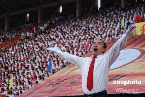 2008年9月28日,重慶市云陽縣在該縣體育場舉行盛大活動慶祝國慶節(jié),近萬名機關(guān)干部、中小學(xué)生、社區(qū)群眾齊唱《歌唱祖國》、《沒有共產(chǎn)黨就沒有新中國》、《閃閃的紅星》等經(jīng)典紅歌,祝福祖國節(jié)日快樂,更加繁榮富強。中新社發(fā) 劉小洋 攝