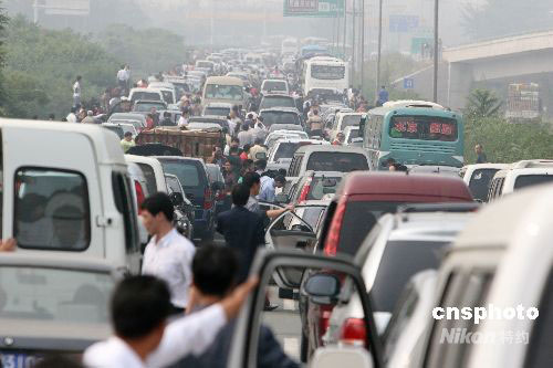2008年10月1日,北京八達(dá)嶺高速公路出現(xiàn)爆堵。受出游車輛過多影響,中午12點(diǎn)之后,北京昌平西關(guān)到八達(dá)嶺水關(guān)路段幾近癱瘓,駕乘人員紛紛走出車外等候通車,甚至有人在路中間打球、打撲克以打發(fā)時間。中新社發(fā) 魯谷 攝