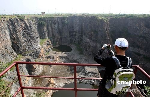 “十一”黃金周期間,位于上海佘山國家旅游度假區(qū)橫山東側(cè)海拔負(fù)87米、周長1000多米的“天坑”,吸引不少游客前去參觀留念。據(jù)悉,到2010年,一個(gè)海拔負(fù)87米的五星級酒店將在這個(gè)大坑內(nèi)建成,并有望成為世界上人工坑內(nèi)海拔最低的酒店。該坑是一個(gè)早年人工采石場,四周懸崖峭壁。中新社發(fā) 湯彥俊 攝