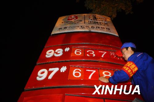 10月7日凌晨,北京一加油站的工作人員在更換汽油價格標簽。當日零時,北京汽油價格上漲,93號汽油漲至每升6.37元,97號汽油漲至每升6.78元。新華社記者 邢廣利 攝
