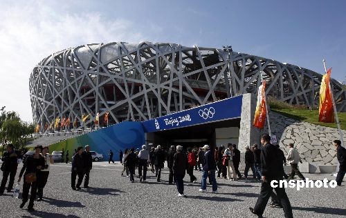 北京國家體育場“鳥巢”和國家游泳中心“水立方”成為繼天安門、故宮、長城等著名景點后又一旅游熱點。10月11日,北京陽光明媚,無數(shù)人攜帶家眷、伴結(jié)朋友漫步奧林匹克公園,近距離欣賞鳥巢魅力。中新社發(fā) 王麗南 攝