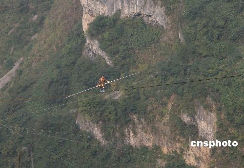 18日,“高空王子”阿迪力的親侄子賽買提·艾江在張家界天門山的萬仞絕壁之間展示了“達瓦孜”的驚人絕技。雖然賽買提在最后50米處意外“失手”,被救援人員接回終點,但在傾斜達39度的鋼繩上行走了650米,已經成功挑戰(zhàn)了世界最大斜度的高空走鋼絲極限!斑_瓦孜”意思是“高空走繩索”,是新疆維吾爾族歷史悠久的民間傳統(tǒng)絕技。中新社發(fā) 鄧霞 攝