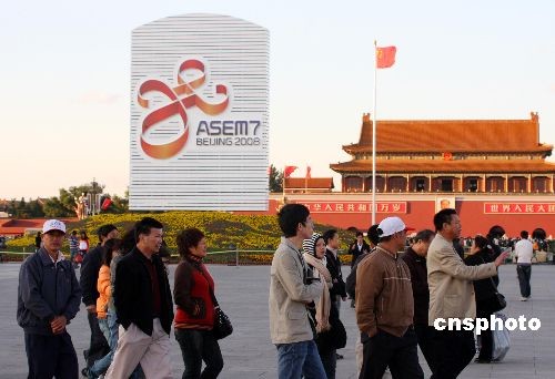 10月23日,北京天安門廣場一派祥和,以亞歐首腦會議為主題的花壇光彩奪目,第七屆亞歐首腦會議將于10月24日至25日在京舉行,這是繼2008奧運會后北京舉辦的一次重要的國際性盛會。中新社發(fā) 吳芒子 攝