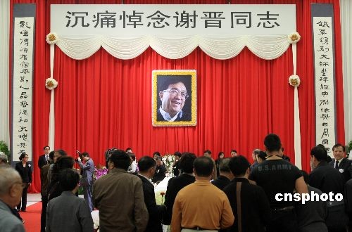 10月26日,中國著名導演謝晉追悼儀式在上海龍華殯儀館舉行,社會各界人士自發(fā)到場為一代電影大師送行。謝晉導演于10月18日凌晨在浙江上虞去世,享年85歲。他生于1923年,浙江上虞市人,主要代表作有《女籃5號》、《紅色娘子軍》、《牧馬人》、《天云山傳奇》、《鴉片戰(zhàn)爭》、《芙蓉鎮(zhèn)》等。中新社發(fā) 湯彥俊 攝