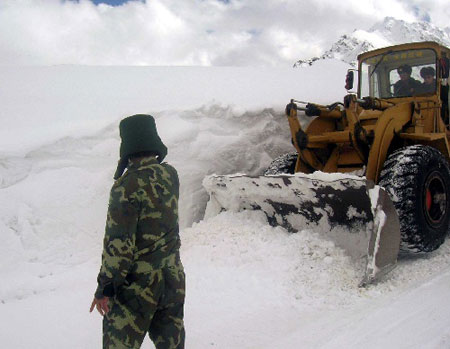 受持續(xù)強降雪和雪崩影響,川藏公路西藏境內(nèi)東達山至牛踏溝部分路段交通中斷。擔(dān)負川藏公路竹東段養(yǎng)護保通任務(wù)的武警交通部隊緊急啟動搶險預(yù)案,出動機車、兵力趕赴受災(zāi)現(xiàn)場全力搶通道路。 新華社記者 葉輝 攝
