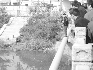27日上午9點多,拖板橋南側(cè)站滿了看熱鬧的市民。大家都扒在橋欄桿上,向河里探頭張望,一個二十多歲的小伙子翻過橋欄桿,站到臨河四五米的管道上釣魚。這條黃色的管道直徑只有三十厘米,圓溜溜的,很難掌握平衡,但小伙子毫不在意,拿著一根魚竿,目不轉(zhuǎn)睛地盯著河面。