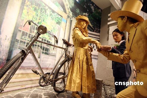 10月28日,行為藝術(shù)者在河北省霸州市新落成的華夏民間收藏館自行車博物館內(nèi)表演,表演者倚靠的是著名民間收藏家王明璽老人收藏的1910年英國(guó)生產(chǎn)的白金人牌自行車。該車只生產(chǎn)了100輛,進(jìn)入中國(guó)10輛,這是目前發(fā)現(xiàn)保存最為完好的一輛。當(dāng)日,第二屆霸州文化藝術(shù)節(jié)在河北省霸州市隆重開(kāi)幕。中新社發(fā) 毛建軍 攝