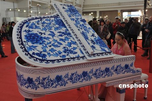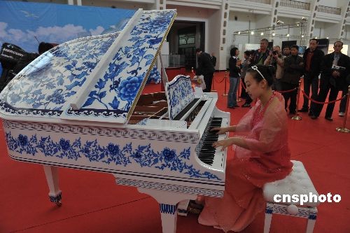 10月28日,在中國東北亞(沈陽)進口商品博覽會上,一名少女在彈奏青花瓷鋼琴,F(xiàn)場的工作人員介紹說,這架名為琴瓷的鋼琴是專門為前不久舉辦的國際樂器展覽會制作的,琴身上的瓷紋是由技術人員手工雕刻而成,目前在世界上僅有這一架,市場售價在46.9萬元左右。中新社發(fā) 徐建國 攝