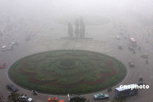 10月30日,江蘇連云港華聯(lián)廣場(chǎng)車輛在大霧中緩慢行駛。當(dāng)天,江蘇連云港遭遇一場(chǎng)大霧襲擊,霧大的地段能見度不足50米,境內(nèi)的高速路全部關(guān)閉,影響了市民正常出行。中新社發(fā) 穆道勇 攝