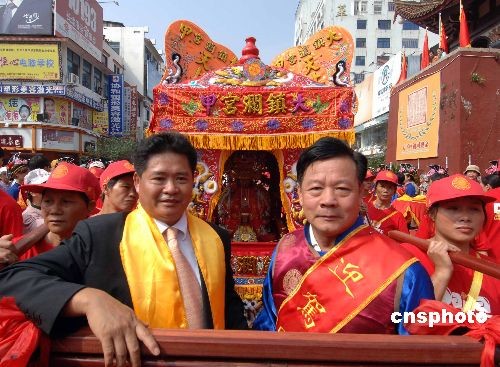 湄洲媽祖祖廟董事會(huì)董事長林金榜(右二)歡迎臺(tái)灣大甲鎮(zhèn)瀾宮來賓護(hù)媽祖神駕回娘家。