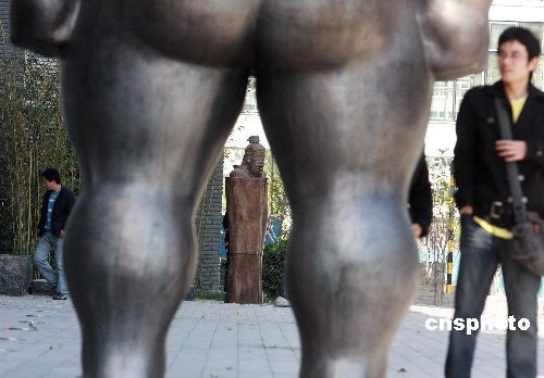 11月2日,北京大學光華管理學院新樓門前,中央美術學院雕塑系兩位老師申紅飆于2008年創(chuàng)作的《蒙古漢——站》,田世新于2003年創(chuàng)作的《剛?cè)嶂馈献酉瘛罚^往行人的目光。這兩尊雕塑,一尊是逾3米高、露生殖器的壯漢,一尊則是張嘴露齒的老子雕像,它們相對而立,近日引發(fā)爭議。中新社發(fā) 鄭雄增 攝