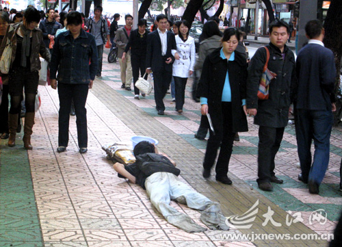 3日下午5時許,一個20出頭“高位截肢”的小伙艱難爬行在南昌市中山路人行道上,向路人訴說不幸遭遇:“一場車禍奪走了父母的生命,我也因這場車禍高位截肢!币恍┖眯氖忻褚姞,紛紛慷慨解囊。傍晚6時30分許,“截肢”小伙爬進了一條小巷內,另一男子提來了一大包衣服。這時,“截肢”小伙突然站了起來,換上一套時尚的休閑裝?吹接浾吲恼,兩人迅速消失。(文/圖劉虎記者歐陽蘇敏)