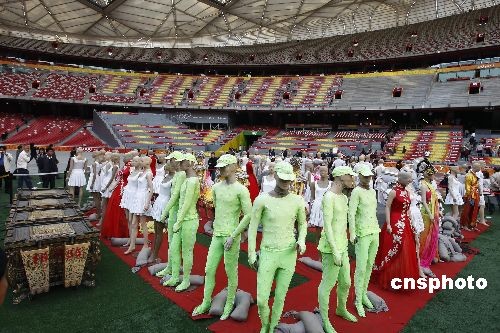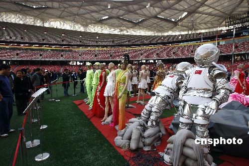 11月6日,在北京奧運(yùn)會(huì)開(kāi)幕式中用于演出的服裝道具擺放在國(guó)家體育場(chǎng)“鳥(niǎo)巢”,供游客參觀。中新社發(fā) 杜洋 攝