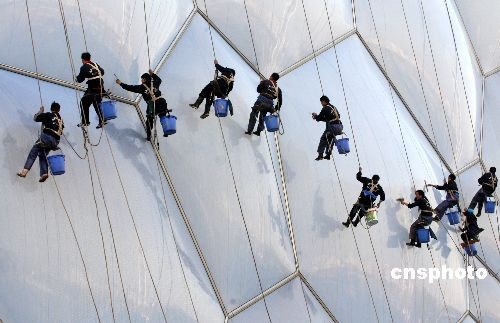 11月7日,清潔工人對“水立方”室外膜結(jié)構(gòu)進(jìn)行清洗。國家游泳中心有限責(zé)任公司相關(guān)負(fù)責(zé)人表示,這是奧運(yùn)會后水立方首次全身“洗澡”。此次清洗主要是因?yàn)楸本┤肭锖罂諝庵袎m土較多,專業(yè)的保潔人員只是幫助水立方擦去外層附著的塵土。所以,清洗時(shí)并不需要特殊的清洗液,只要清水即可。而水立方內(nèi)部膜結(jié)構(gòu)此次并不需要清潔。中新社發(fā) 吳芒子 攝