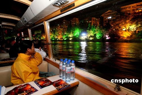 2008年桂林山水文化旅游節(jié)藝術(shù)巡游將于11月9日晚開(kāi)啟序幕,眾多嘉賓云集參加多項(xiàng)活動(dòng)。圖為11月8日晚,游客乘船欣賞桂林市區(qū)兩江四湖美麗夜景。中新社發(fā) 王麗南 攝