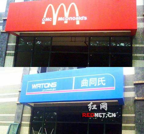 紅網(wǎng)長沙11月9日訊(記者 耿紅仁)“這擦邊球打得很牛很雷人,真是山寨店鋪大薈萃!”8日晚上,網(wǎng)友“鍋爐工”在紅網(wǎng)論壇發(fā)帖爆料,稱在網(wǎng)上看到一個(gè)題為《對不起,我真的被雷到了,南京最雷人山寨店群》的圖片帖,圖片顯示在南京文安街上,林立的店鋪清一色是山寨名牌店鋪,其中屈臣氏、必勝客、麥當(dāng)勞、李寧、星巴克、哈根達(dá)斯等分別被克隆成曲同氏、必勝糊、李明、巴克星、哈根波斯等。