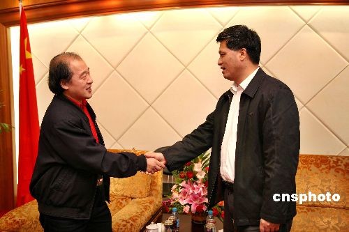 全國(guó)政協(xié)委員、中國(guó)航天科技集團(tuán)公司黨組書記馬興瑞(右)代表全體航天人向畫作《騰飛》作者、著名畫家王書平教授表示感謝。