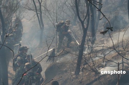 11月13日下午,武警官兵在廣東省珠海市板樟山南側(cè)山林撲救山火。當(dāng)日14時25分,珠海市板樟山南側(cè)山林突發(fā)山火,火勢兇猛,迅速向市內(nèi)居民區(qū)蔓延。接到火情命令后,武警廣東總隊珠海市支隊緊急出動100名官兵,火速趕往現(xiàn)場,奮戰(zhàn)三小時成功將山火撲滅,搶救山林12畝。 中新社發(fā) 陸建東 攝