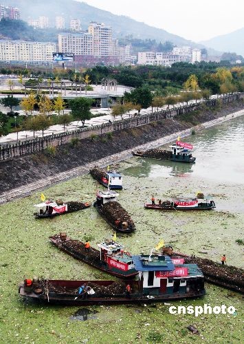 11月18日,重慶市云陽移民新縣城濱江庫岸公園一帶水域,三十多艘打撈船展開協(xié)作會戰(zhàn)大攻勢,準(zhǔn)備“吃掉”最后的集合漂浮垃圾。從三峽庫區(qū)腹心區(qū)縣清漂工作現(xiàn)場獲悉,目前整個三峽蓄水清漂已進(jìn)入“收官”大戰(zhàn),大面積滯留、回旋、淤積漂浮物已從江面清除上岸。中新社發(fā) 饒國君 攝