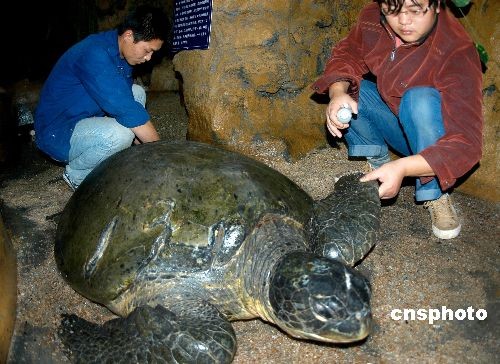 11月22日,綠海龜靜靜趴在溫度適宜的暫養(yǎng)池里,水族館技術人員用藥為它治療傷口。日前,江蘇連云港市連島水族館收治了一只巨型綠海龜,經(jīng)過幾日精心救治,這位超過100歲的老壽星會慢慢地將頭抬起來。據(jù)介紹,這只海龜長約160厘米,寬約100厘米,頭部、右前方和左后方龜蓋上有明顯傷痕,可能是在海水里被螺旋槳劃傷的,伸手觸摸可以摸到肉,在剛接來時右后腿還在流血,眼睛也受感染。水族館收治后,派三位專人悉心照料,待傷情恢復后再放歸大海。這只巨型綠海龜是贛榆縣宋莊鎮(zhèn)漁民在收網(wǎng)時無意中捉到的。中新社發(fā) 王春 攝