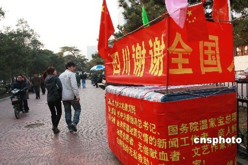 11月24日,四川汶川特大地震災區(qū)災民寫給全國人民的感謝信亮相北京街頭,巨型橫幅標語吸引不少路人的目光。中新社發(fā) 鄭雄增 攝
