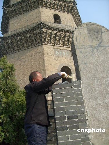 圖為工人正在小心翼翼地為塔前石碑建設(shè)碑樓。