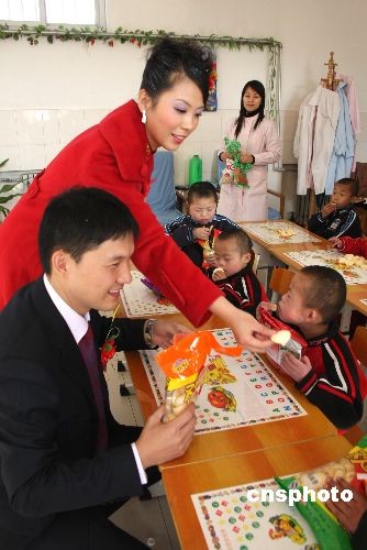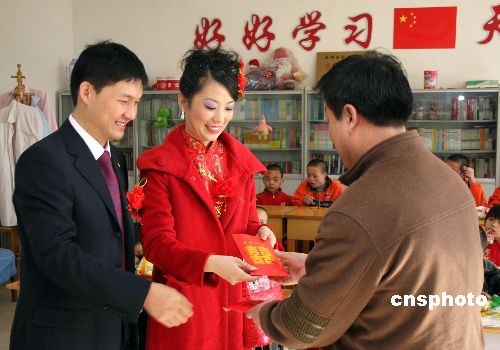 11月29日,身在廣東公安系統(tǒng)工作的梁智、王文星兩位新婚警察夫婦在河北滄州老家舉辦婚禮,他們決定把親友送的婚禮紅包禮金15888元分別捐獻給四川地震災(zāi)區(qū)和滄州市福利保障院的智障兒童。結(jié)婚典禮結(jié)束后,這對新婚夫婦驅(qū)車前往福利院看望兒童,并向當(dāng)?shù)孛裾块T捐獻了自己的結(jié)婚紅包禮金。中新社發(fā) 楊志濤 攝