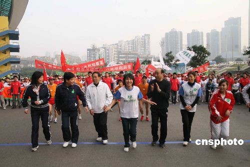 11月29日,“東方神鹿”王軍霞(左四)現(xiàn)身某公司在重慶組織的健康跑活動(dòng),帶領(lǐng)萬余名長跑愛好者在初冬時(shí)節(jié)“跑起來”。中新社發(fā) 杜遠(yuǎn) 攝