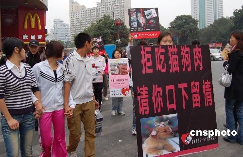 12月21日,廣西南寧部分愛貓人士在街頭舉牌宣傳,號(hào)召民眾“拒吃貓、狗肉”,并呼吁官方出臺(tái)反虐待動(dòng)物法。中新社發(fā) 劉萬強(qiáng) 攝