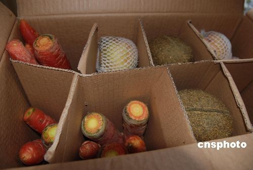 12月23日,贈臺大熊貓“團(tuán)團(tuán)”、“圓圓”離開雅安碧峰峽前往成都雙流國際機(jī)場。臺灣人民期盼已久的“團(tuán)團(tuán)”、“圓圓”,終于踏上了赴“寶島”臺灣之路。圖為大熊貓途中所用食物。中新社發(fā) 陳學(xué)梅 攝