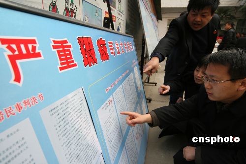 12月25日,法官在觀看有嚴(yán)重瑕疵的司法文書(shū)制成的展板。當(dāng)日,為維護(hù)法院生效裁判文書(shū)的嚴(yán)肅性,提高法院的審判質(zhì)量、司法文書(shū)制作水平,該市魏都區(qū)人民法院將本省近年來(lái)存在嚴(yán)重瑕疵的司法文書(shū)制成展板作為反面教材,在法院內(nèi)部進(jìn)行展示,教育廣大法官引以為戒,舉一反三,對(duì)照檢查自己在工作中存在的不足。中新社發(fā) 牛書(shū)培 攝