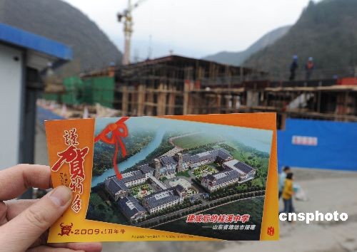 胡總書記12月27日到北川縣桂溪中學考察看望時,一位羌族女學生向臨告別時的總書記送上一封信和這張學校震后重建規(guī)劃圖的賀年片。圖為羌族學生展示送給胡總書記的賀年片。中新社發(fā) 賈國榮 攝