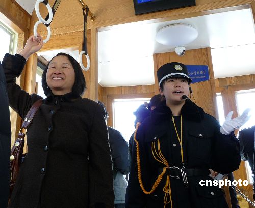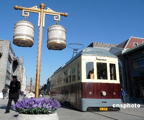 2009年1月1日,北京前門兩輛“鐺鐺車”舉行了開通剪彩儀式后,于上午11點正式載客運行,京城市民及各地游客紛紛乘坐“鐺鐺車”感受老北京的風(fēng)情。時隔50年后那“鐺鐺”的聲音再次回到了煥然一新的前門大街。 中新社發(fā) 玉龍 攝