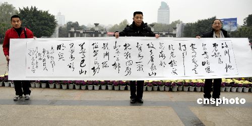1月5日,一幅飽含地震災(zāi)區(qū)群眾深情的巨幅詩(shī)詞書法作品《唐家山頌》在四川省南充市創(chuàng)作完成。這幅作品寬5.12米,高0.8米,由南充市退休干部張?bào)w政撰稿,書法家何文軍以草書體創(chuàng)作成傳統(tǒng)書法藝術(shù)卷軸,以表達(dá)地震災(zāi)區(qū)群眾對(duì)廣大解放軍指戰(zhàn)員和武警官兵抗震救災(zāi)英雄壯舉的感激和敬仰之情。張?bào)w政、何文軍即專程把這幅飽含地震災(zāi)區(qū)群眾深情的詩(shī)詞書法作品送往北京。圖為飽含地震災(zāi)區(qū)群眾深情的詩(shī)詞書法作品《唐家山頌》。中新社發(fā) 肖洪環(huán) 攝