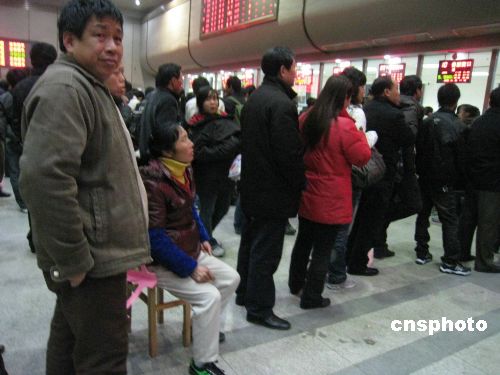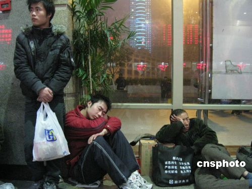 運輸部門近日表示,2009年春運將從一月十一日開始至二月十九日結束。據(jù)預測,在40天里浙江省將有近1.946億的旅客通過各種交通方式出行。受金融危機的影響,目前已經(jīng)無工可做的打工者選擇了提前返鄉(xiāng),以致浙江發(fā)往湘、鄂、黔、贛等地的車次出現(xiàn)“一票難求”的現(xiàn)象。中新社發(fā) 孫寧亞 攝
