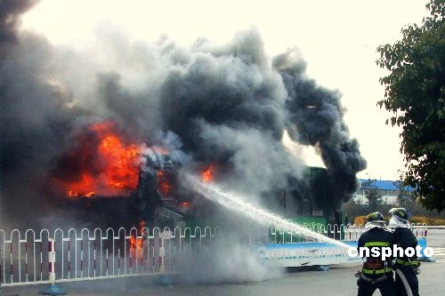 2009年1月9日下午兩時,江蘇鹽城市區(qū)一20路公交車行駛到鹽瀆路與西環(huán)路交界處發(fā)生自燃,當(dāng)時車內(nèi)有七八名乘客,由于疏散及時,并沒有造成人員傷亡,火也被消防人員及時撲滅,車輛卻受損嚴(yán)重,公交部門初步斷定起火原因是電路故障。中新社發(fā) 李根 攝